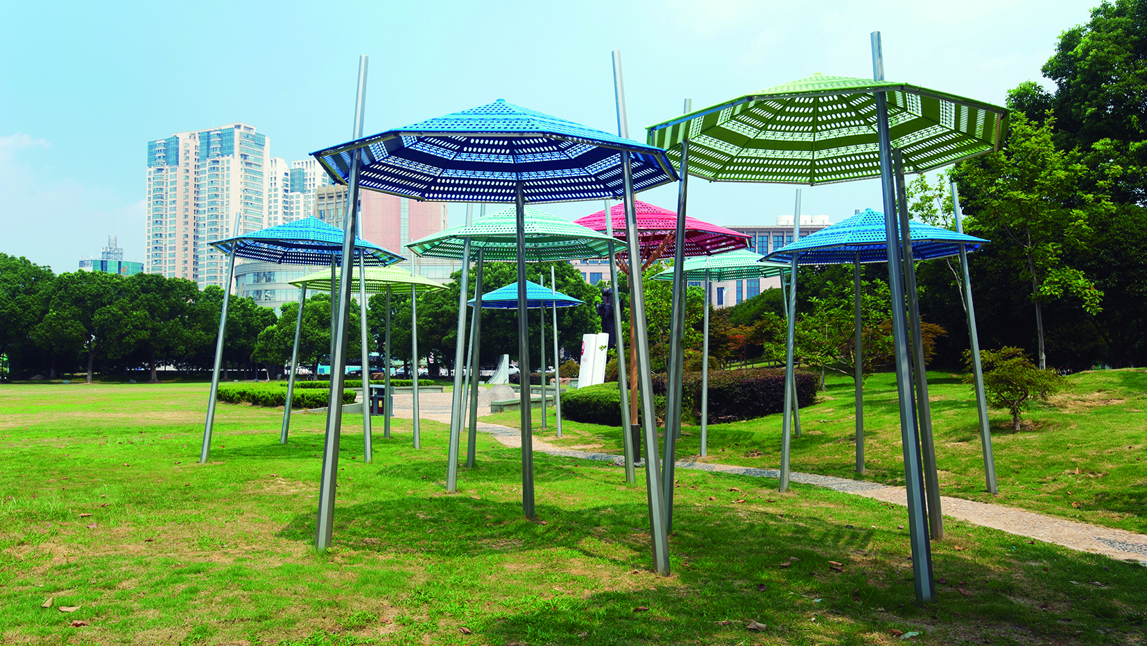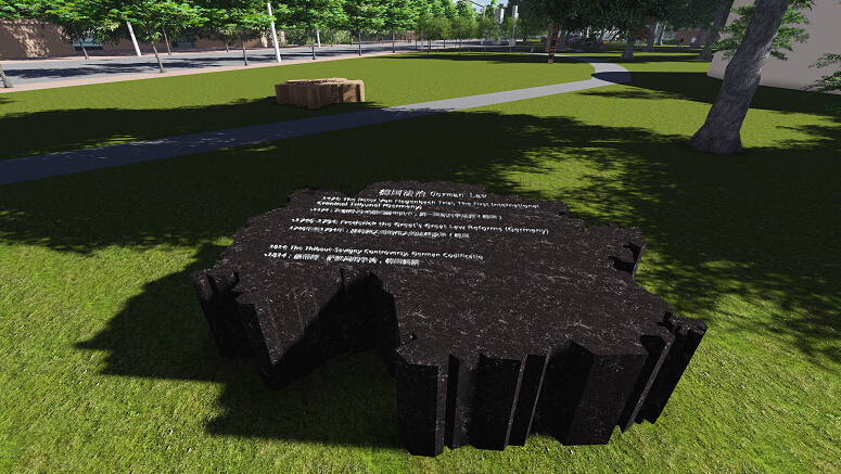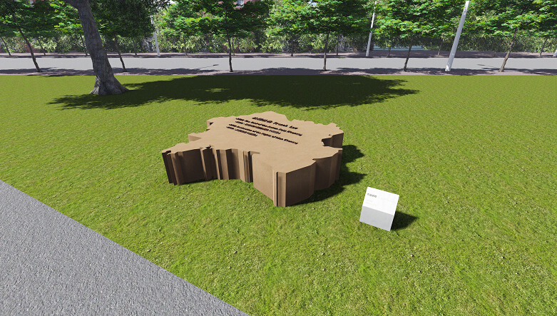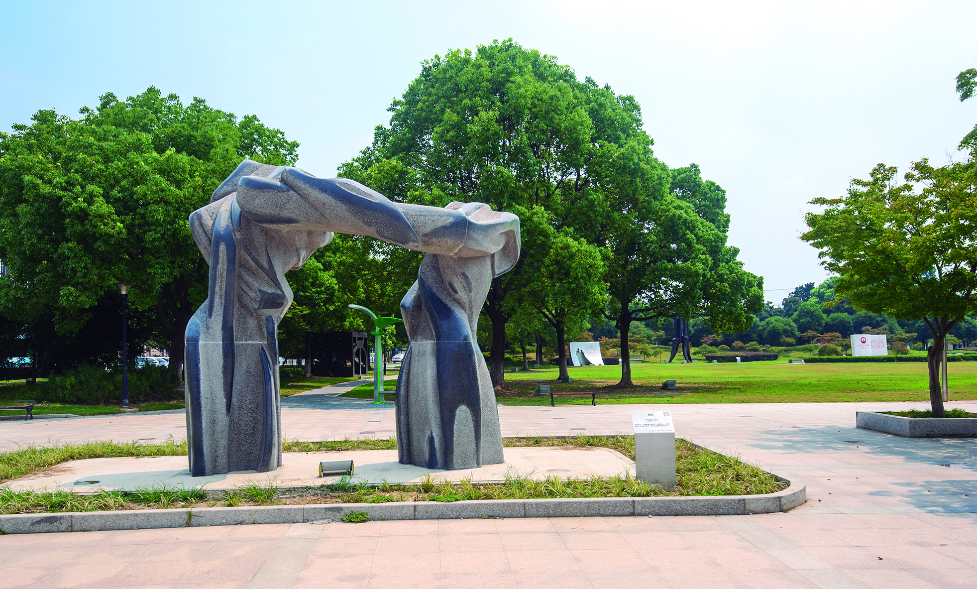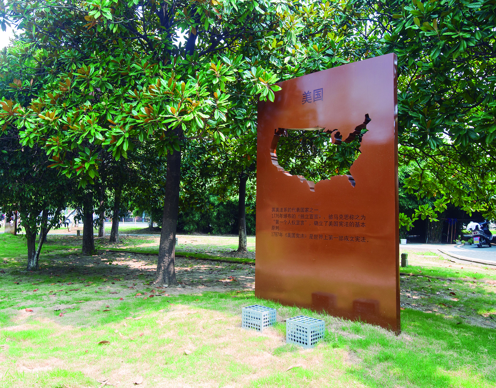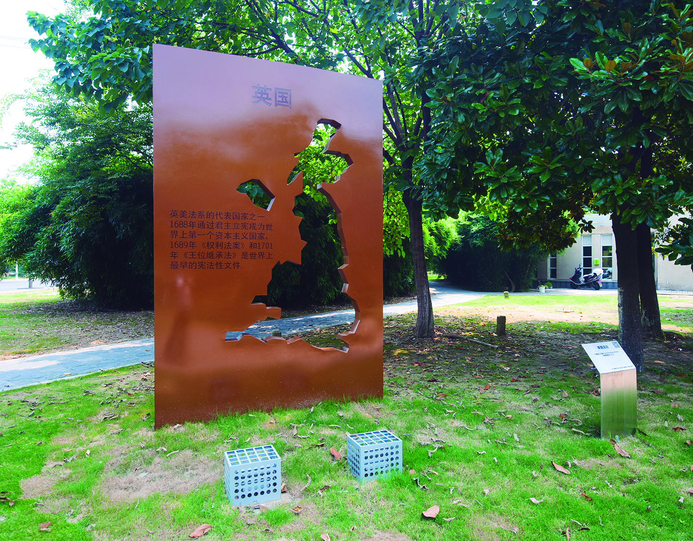 山水明鉴本意是经得起时间的考验和法律的审判,代表公心与正义。雕塑上半部分是山,下半部分是山在水中的倒影,是抽象化的水。