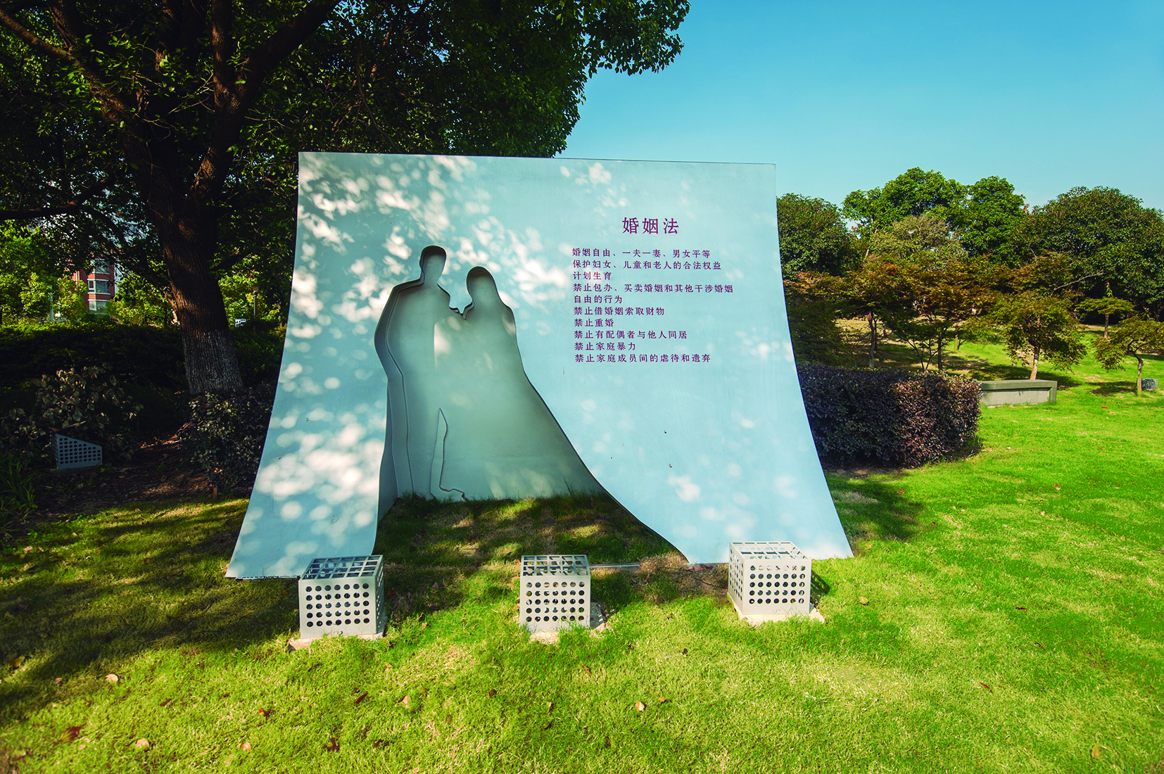 以书本形式展现《婚姻法》,象征在《婚姻法》的保护之下,每个家庭都幸福美满、平平安安。